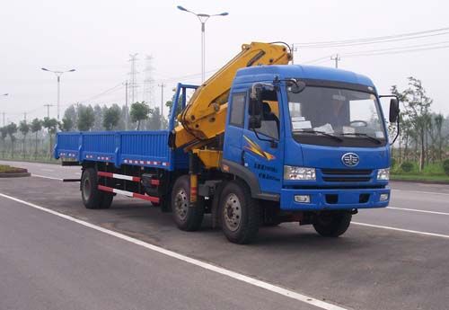侧面防护装置的横杆材料为Q235-A,螺栓连接,后面防护装置材料为16MnReL,后防护断面尺寸110×110mm,焊接连接,离地高度为500mm;该车装配具有卫星定位功能的行驶记录仪;可装配两种直臂式吊机,吊机型号/吊机重量(kg)/额定起升质量(kg)/整备质量(kg)/载质量(kg)/关系为: 1,SQ8: 3500/8000/9570/6035, 2,SQ6.3:3300/6300/9170/6435.ABS系统生产厂家:广州市科密汽车制动技术开发有限公司.型号: CM4XL-4S/4K.