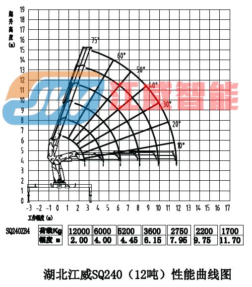 上装配置:江威12吨全折臂,2米最大起重12吨,11.7米最大起重1.7吨